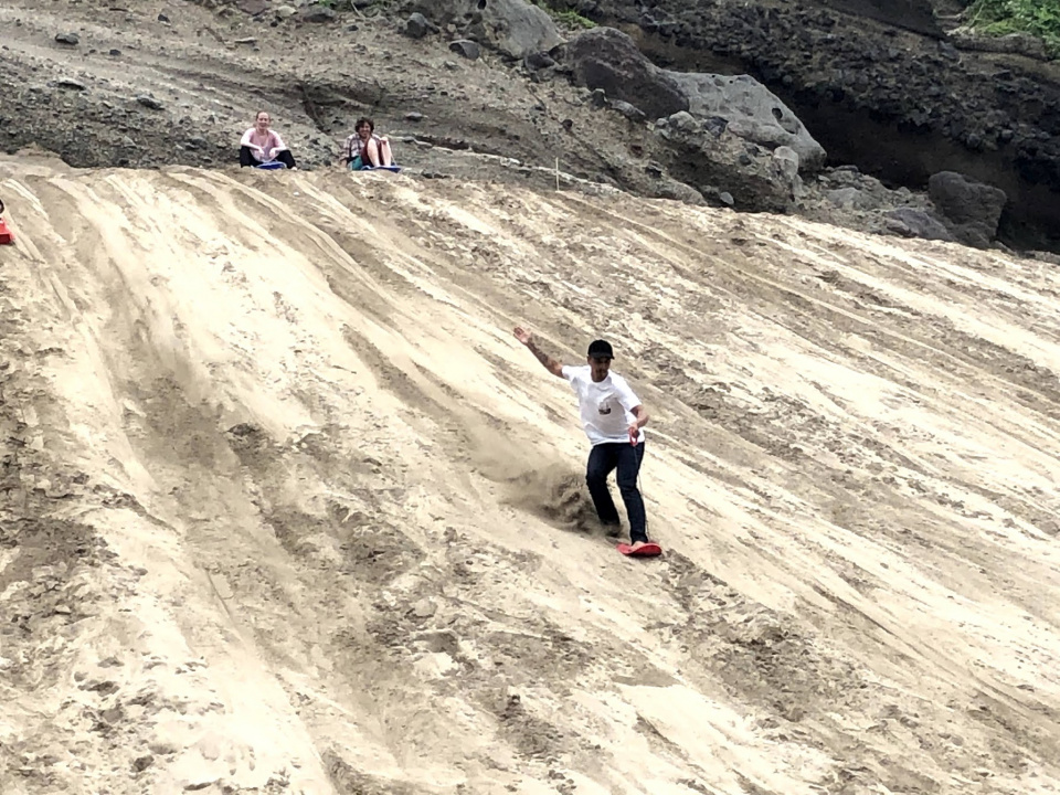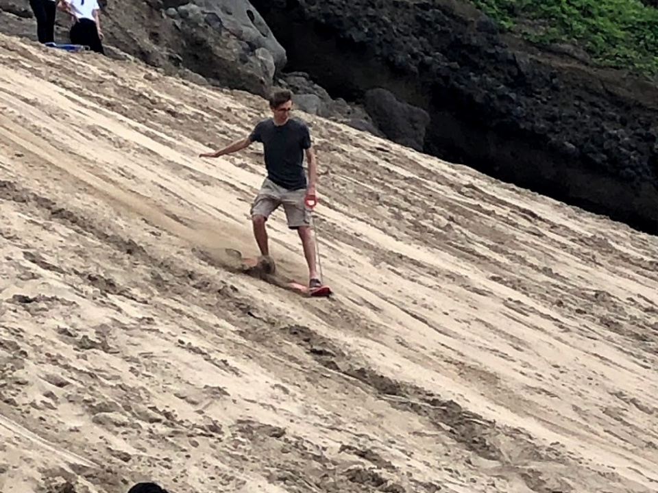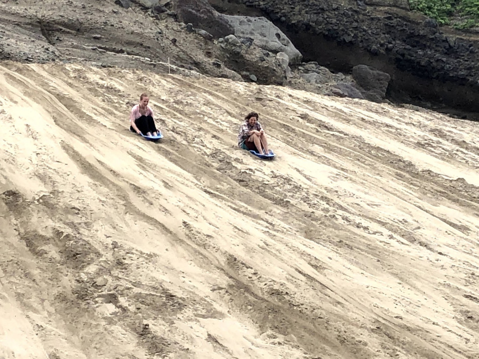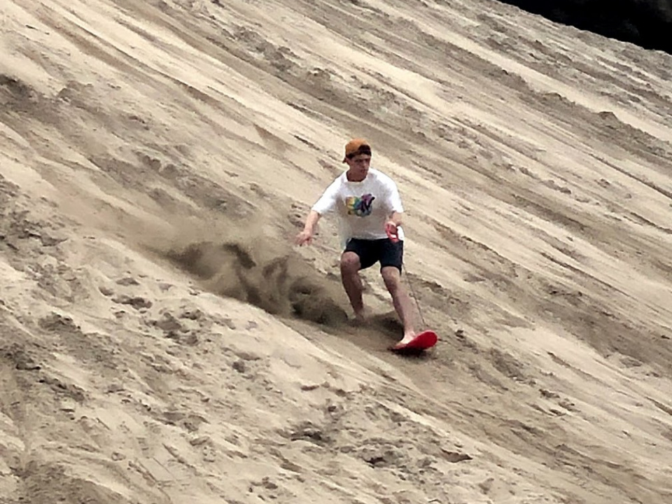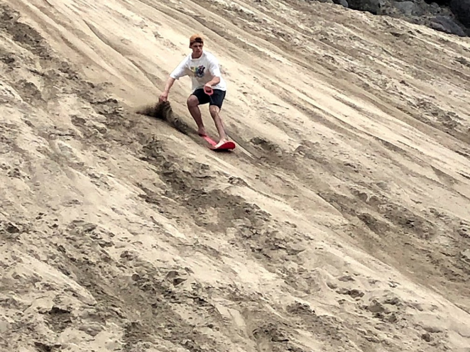 Standing at the top is very intimidating. The 30 degree angle looks much steeper when you’re faces with the prospect of having to slide down it. Plonk yourself on the sled and slowly inch yourself to the slope. It’s much easier to get over the fear at first if you’re racing your friends/family. The descent is fairly quick and you will more than likely fall off the sled/board. The sand is very unstable so it’s very easy to go tumbling down. IT doesn’t hurt so don’t worry about that. It just means you’ll end up with sand everywhere!